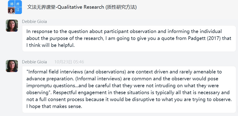 Deborah Gioia教授围绕“质性研究方法”这一主题,首先分析了质性研究的理论基础以及文化和伦理道德在质性研究中的地位和作用,并针对研究中可能存在的疑问或难题提出对策建议;其次,详细介绍了质性研究中的内外部视角以及几种主要的质性研究方法,并对学生选择研究问题和开展访谈等步骤进行指导,提倡学生在调查过程中既要保持客观性也要保持灵活性;最后,讲解了质性研究中的数据管理和数据分析方法,分享了四个质性研究热点主题。教学方式以老师讲授和学生参与讨论为主,在课堂互动环节,Deborah Gioia教授针对师生提出的问题,逐一进行了详实而深刻地回答。为加深学子理解课程内容,每一专题都提供相关的外文阅读文献,并布置随堂作业,批改后给学生提出反馈意见。