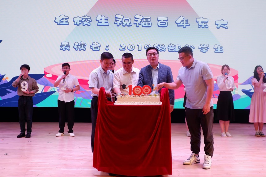 为庆祝东北大学百年华诞,毕业晚会特增设校友祝福母校环节,10余位工作在全国各条战线上的优秀校友向母校报告,并与2023届毕业生一起送上百年校庆祝福。随后,马天威、张雷、隋永强、刘锃一等共同为毕业生切开蛋糕,并向学生代表颁发毕业赠礼,祝福2023届文法学子坚定理想信念,赓续东大文脉,为祖国和人民作出新贡献。