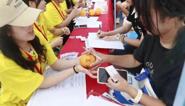 “橙意满满”的阳光鲜橙,写上含有新生名字的祝福成语,既是寓意“心想事成”美好祝愿,更是对新入学的“萌新”们阳光文化的第一次诠释;富有诗意的寝室古谚语门贴,将象征阳光文法的橙色和古韵花纹融合,既是文法寝室的显著标识,也是文科学生独有的精神彰显。一份份温暖和鼓励,帮助大一新生在学业过渡期不再无助与困惑,也延续了文法大家庭和谐友爱、团结互助的优良传统。