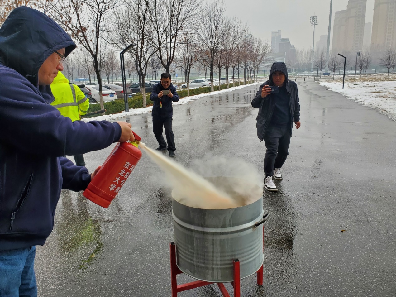 本次消防疏散利用无害烟雾模拟火场真实环境,老师们利用提前发放的毛巾捂住口鼻有序撤离。之后在保障安全的环境下点燃明火,教师们轮流使用灭火器进行灭火实际操作。