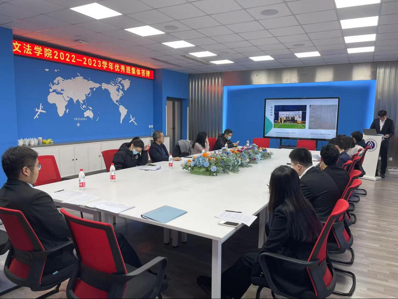 答辩。各班从自身专业特色出发,围绕班集体的团队建设、思想工作、学风建设、社会实践、文体活动等方面,利用PPT生动地展示了班集体一年来取得的成绩,充分展现了班集体的精神风貌。